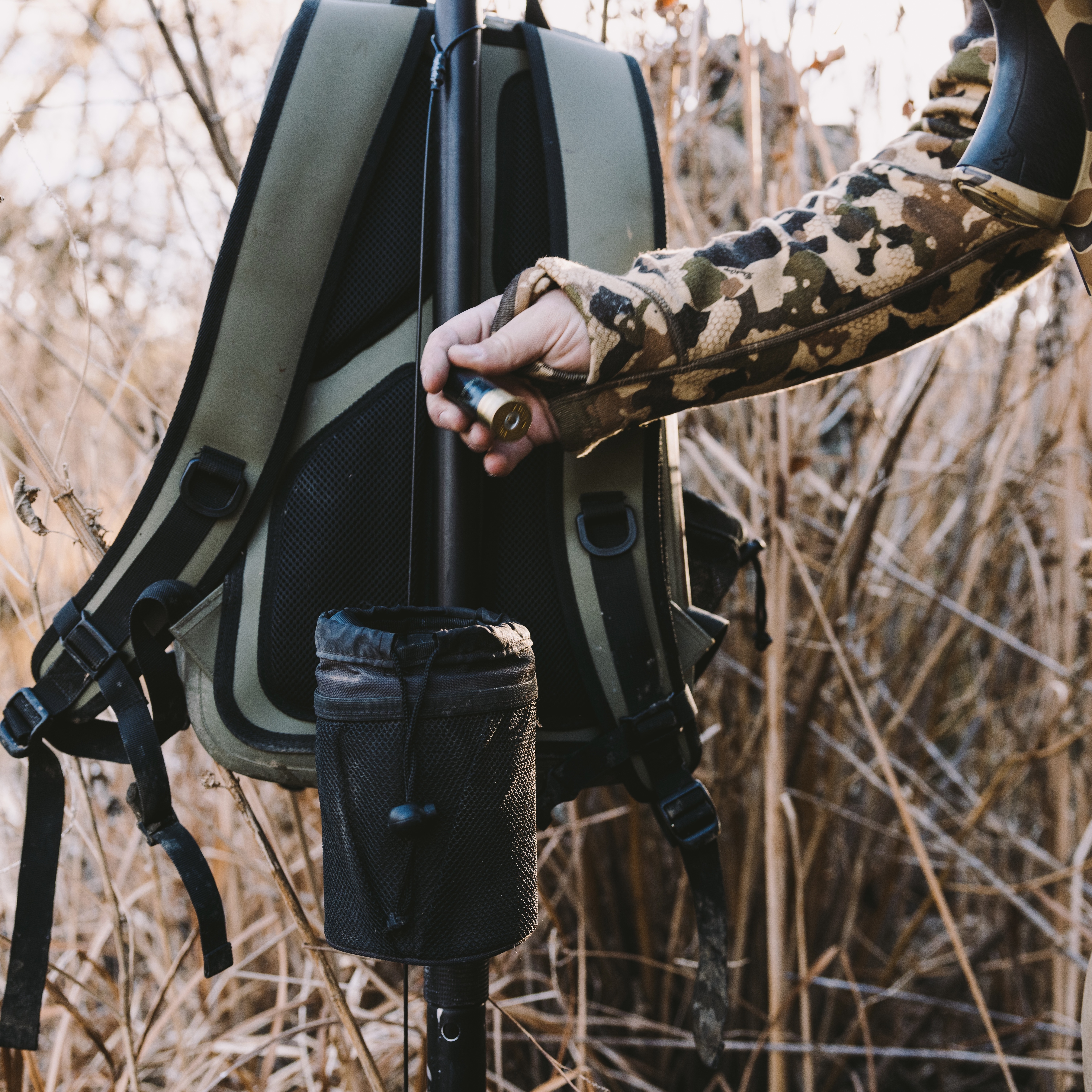 Our Beverage Holder/Shell Pouch clamps right onto your Utiliy Pole making digging in your pack for a thermos or rusted shell's a thing of the past. It even clamps right onto your a-frame blinds!