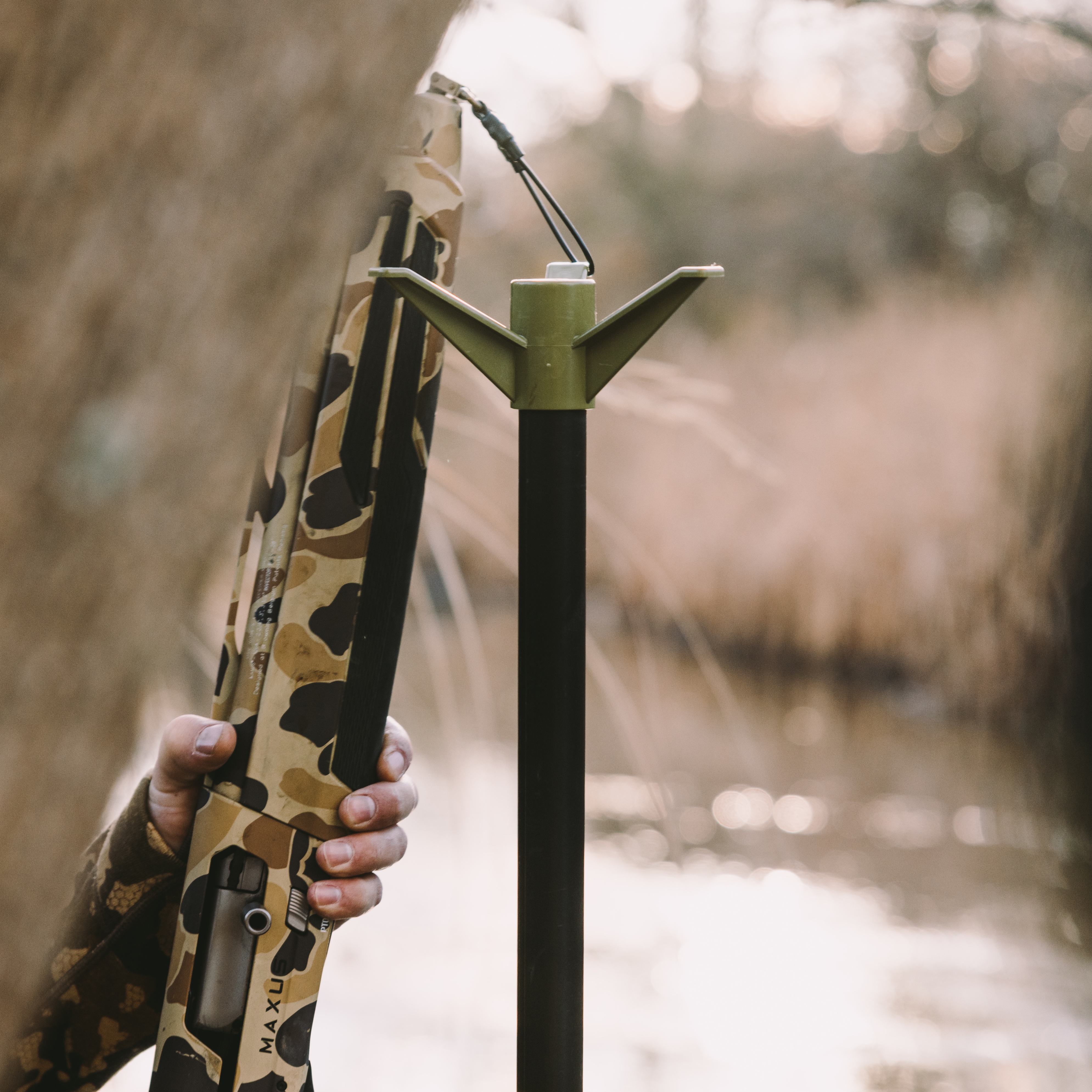 This is the answer for duck hunters. Hang with the loop while in the blind or tree Use the sling when dealing with dekes or walking in. Excellent product and design. Very easy to use RLM